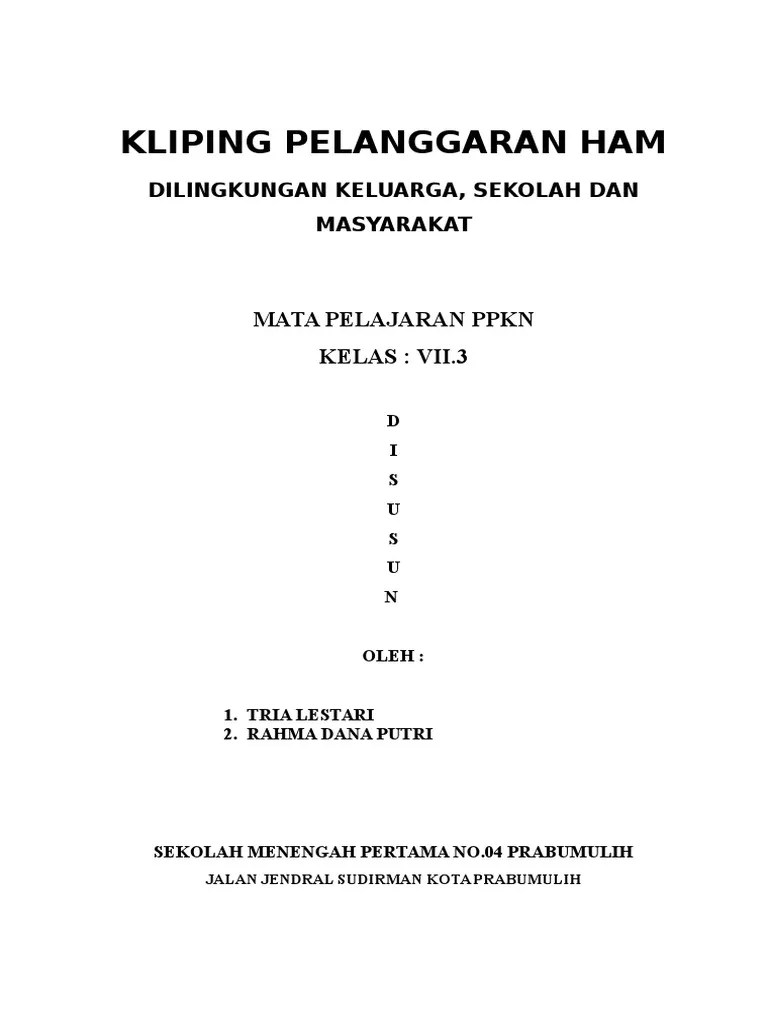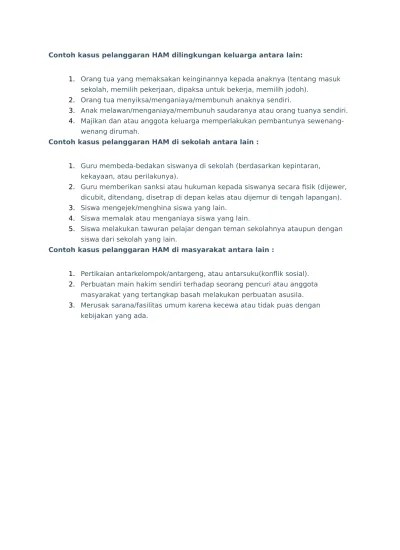 Penyebab pelanggaran ham, baik internal maupun eksternal, termasuk contoh kasus. Komisi perlindungan anak indonesia (kpai) menegaskan bahwa sekolah tidak boleh memaksa siswi mengenakan atau mencopot jilbab. Di berbagai negara, kasus pelanggaran ham baik yang ringan maupun berat. Pelanggaran hak di sekolah dan cara menyeleseikannya 1. Contoh kasus pelanggaran ham dilingkungan keluarga antara lain: · seorang siswa secara paksa . Secara sengaja terlibat tawuran antar pelajar, sesama teman satu sekolah atau lain sekolah Kerusuhan tanjung priok tanggal 12 september. Contoh pelanggaran ham yang terjadi di sekolah tarik biaya sekolah kepsek bisa. Contoh kasus pelanggaran ham berat di indonesia: Contoh pelanggaran ham ringan · seorang siswa dengan sengaja mengejek, mencemooh, dan menyiksa siswa lainnya. Sekolah ramah ham (human rights. Friendly school) adalah sebuah sekolah yang .